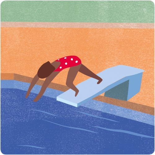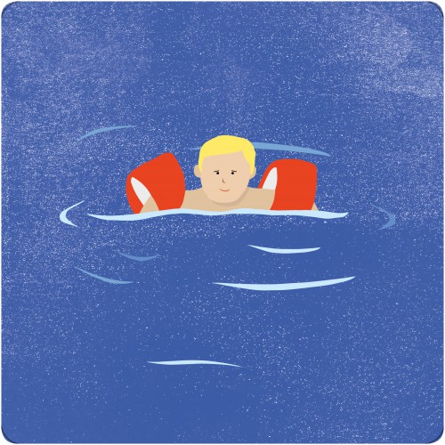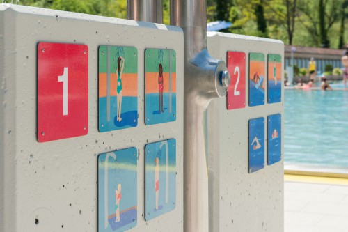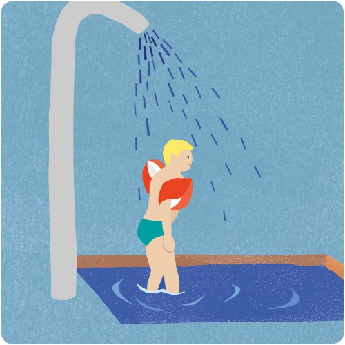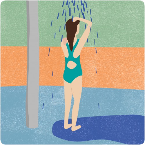 Conception d’illustrations pour la piscine de la Motta. Des plaques informatives invitent les baigneurs à prendre une douche avant de se rendre dans l’eau.