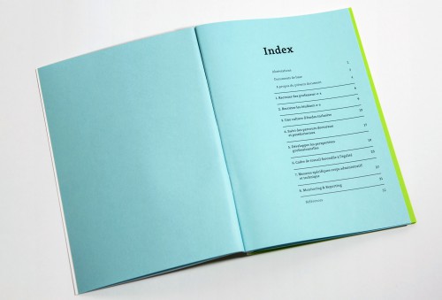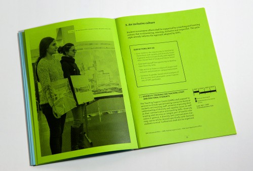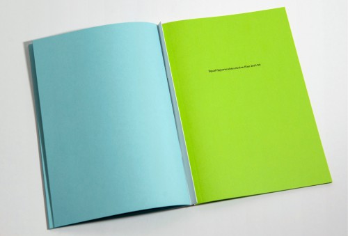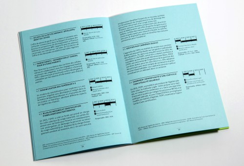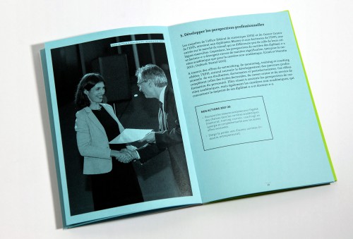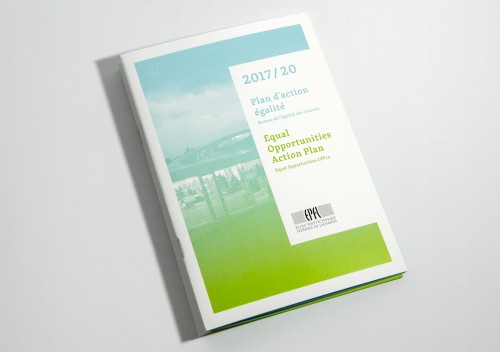 karakter élabore la mise en page de la brochure « plan d’action égalité 2017/20 » pour le bureau de l’égalité des chances de l’EPFL. Les deux langues de la brochure sont marquées par les différentes couleurs du papier.