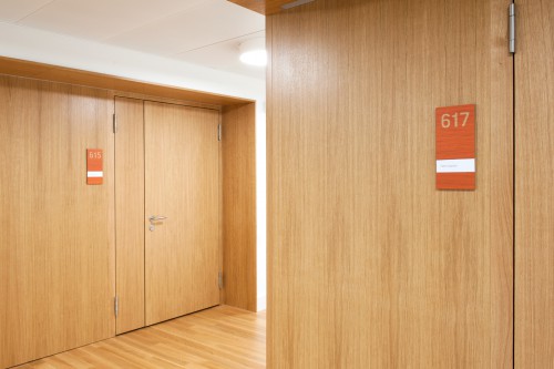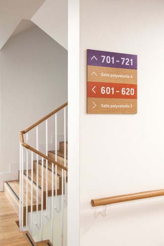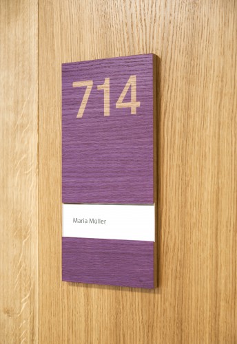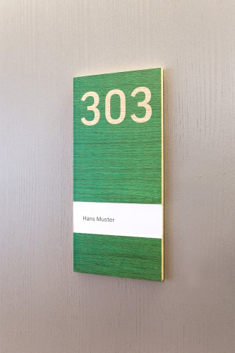 Pour l’agrandissement et la rénovation de la résidence Les Martinets de Villars-sur-Glâne, karakter crée une signalétique 100% bois.